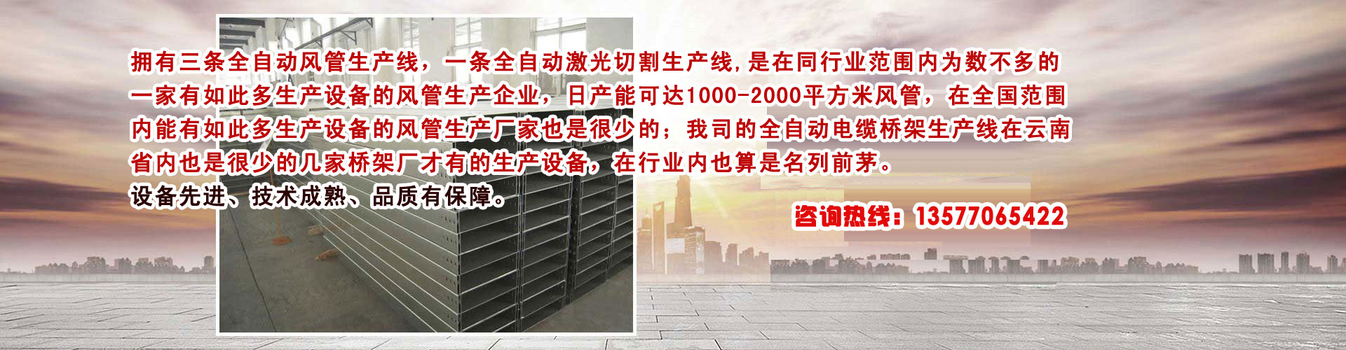 拥有三条全自动风生产线Q一条全自动Ȁ光切割生产线,是在同行业范围内为数不多的一家有如此多生产设备的风管生企业Q日产能可达1000-2000qxc风,在全国范围内能有如此多生产设备的风管生厂家也是很少的;我司的全自动늼桥架生U在云南省内也是很少的几家桥架厂才有的生产设备,在行业内也算是名列前茅?